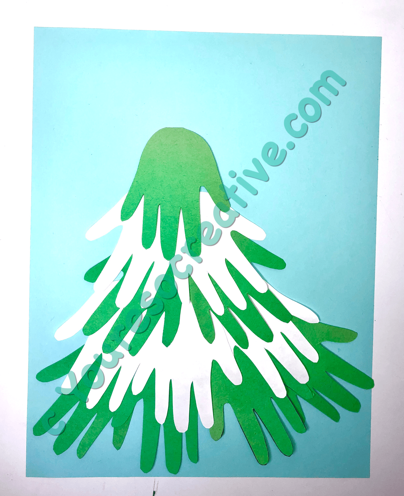 3. Have the little artists glue handprints onto colored sheet of paper. (We alternated rows to look like snow.)