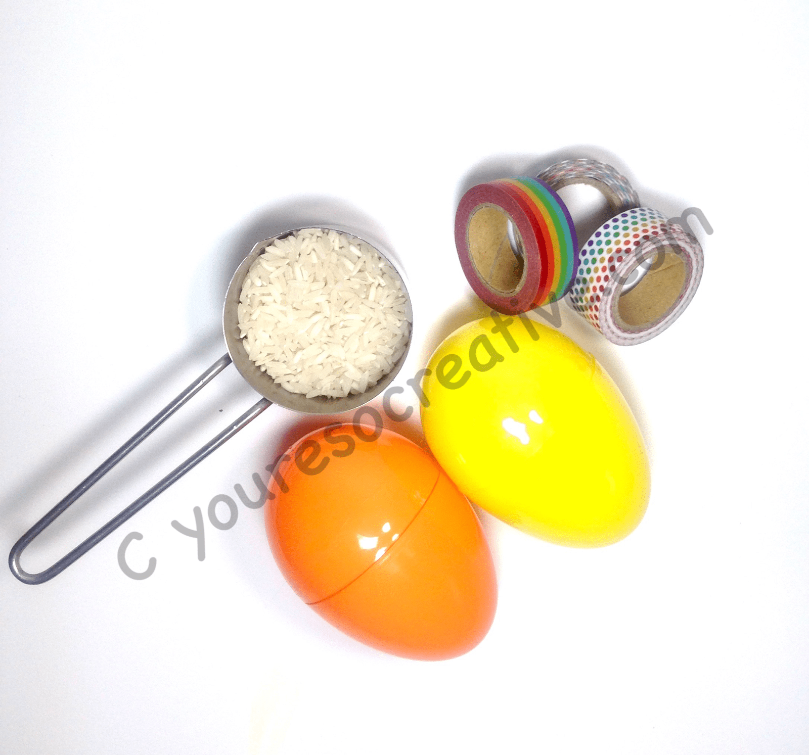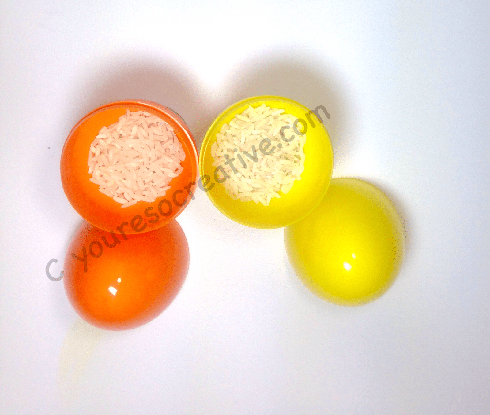 - Pour one spoonful of either dried beans or rice into a plastic egg.