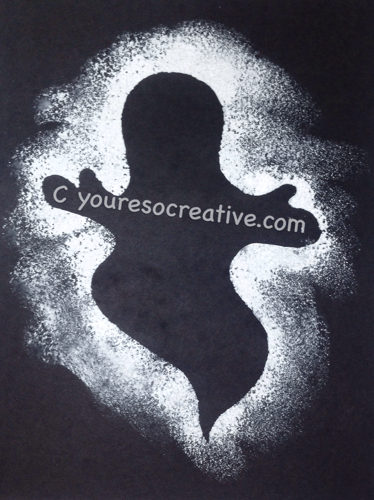 - Help hold the poster board ghost onto the black paper. Have the child sponge paint all around the ghost.